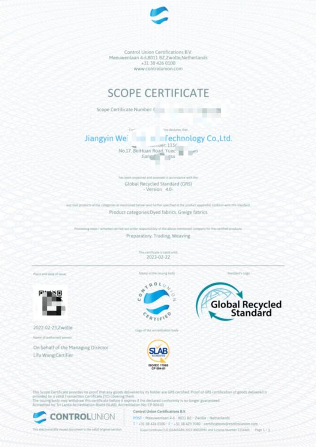 其中包括加工、制造、包装、卷标,销售和使用的所有产品内含量至少20%的再生材料。目前认证主要集中在纺织服装中的企业,例如再生瓶片,再生涤纶长丝,再生涤纶短线,再生面料、再生成衣等。且所有标准的产品都必须显示回收组分的百分比,并将挂上适当的GRS标志。
