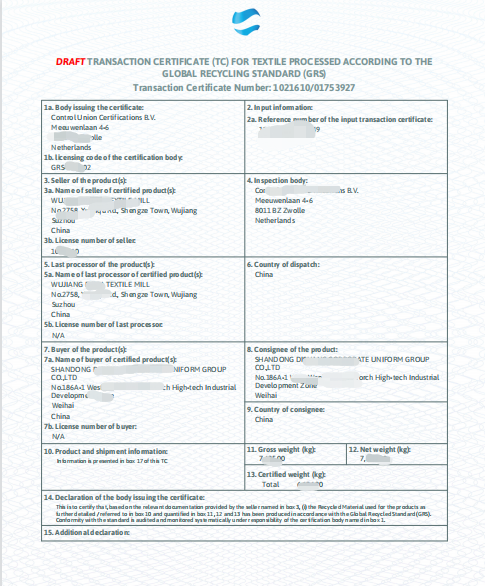 通过GRS认证后的企业,产生了GRS产品的真实交易,一般这个时候客户都会要求我们开具TC给他们,以证明所交易的产品是符合GRS标准的再生产品。