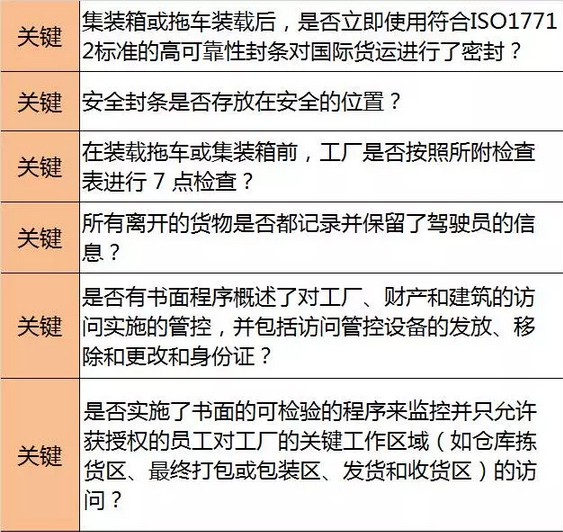 SCAN反恐验厂主要包括几大类:商业伙伴要求、集装箱与拖车安全、运输安全、人员安全、程序安全、物理访问控制、物理安全、安全培训与威胁意识、信息技术安全。