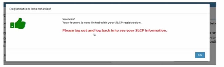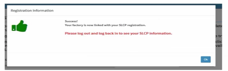 如果您的工厂信息与网关中的FFC完全匹配。您将收到此成功消息,显示您已成功注册。然后请注销平台并再次登录以查看您的SLCP页面。