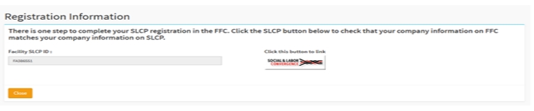 第一次登录时,系统将要求您接受FFC条款和条件,勾选“I accept the terms and condtions”框,并单击“接受(accept button)”按钮。接下来您将登陆SLCP注册页面,在此页面上,您将单击此按钮将您的FFC简介文件链接到网关上的SLCP简介文件。然后您的工厂SLCP ID将自动输入就绪。