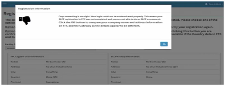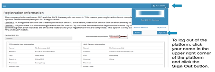 如上图关闭糟糕的消息后,平台一边显示您的FFC工厂数据,另一边显示SLCP工厂数据。如果信息在FFC上足够接近,允许您通过单击“继续注册”按钮转发注册。单击此按钮,表示信息可能不同,它们都是相同的工厂。记住:如果你没有看到按钮,那就是你的国家数据不匹配。如果您的国家/地区数据不匹配,将无法继续进行注册。如果是这种情况,请返回网关以便更新您的国家/地区信息。然后继续执行几个步骤再次尝试注册。单击“继续注册”按钮后,您将看到成功消息,并倾向于注销并重新登录。