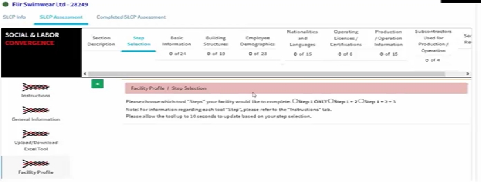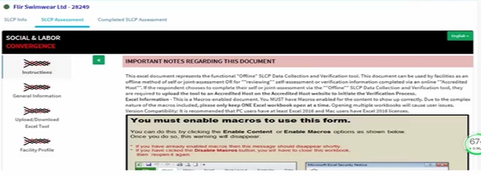当新评估开始时,您将登录到“说明”选项卡,此页仅供参考。如果要更改正在审阅的语言,可以单击此处顶部的按钮。随着时间的推移,会增加更多的语言。当第一次打开SLCP评估时,只有四个部分(说明/一般信息/上传或下载excel工具和工厂概况文件)可用。你选择其中任何一个,相关部分将出现。