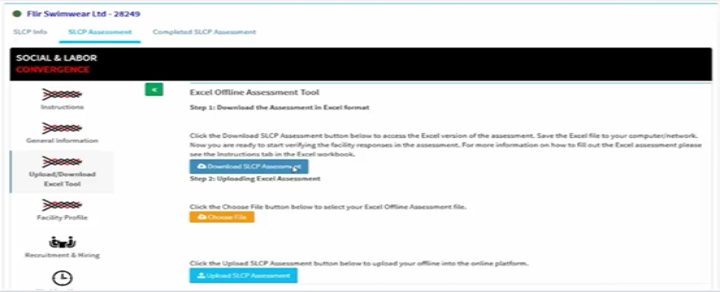 工厂可以选择在线填写评估,也可以选择离线使用excel填写评估。点击菜单中的“上传/下载excel工具”,点击“下载SLCP评估”按钮。如果工厂在线有填写了部分内容,那么下裁的自评excel工具就带有内容,否则自评excel工具内容为空白。