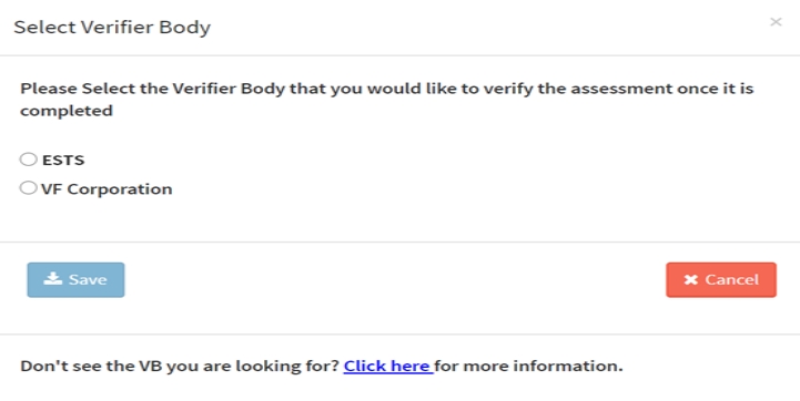 点击“选择验证公司request Verifying Body”按钮去列表中选择验证机构并保存。一旦工厂选择验证公司(VB),就会显示VB的信息。工厂可以在验证开始之前更改VB。