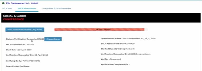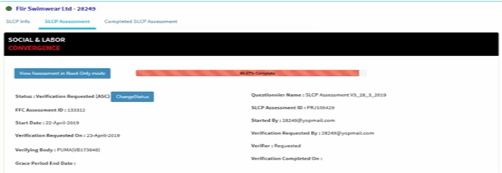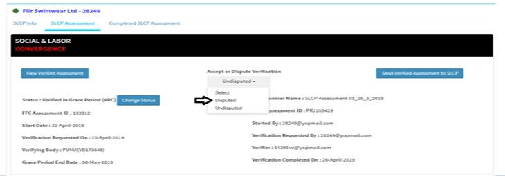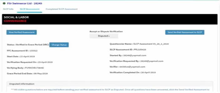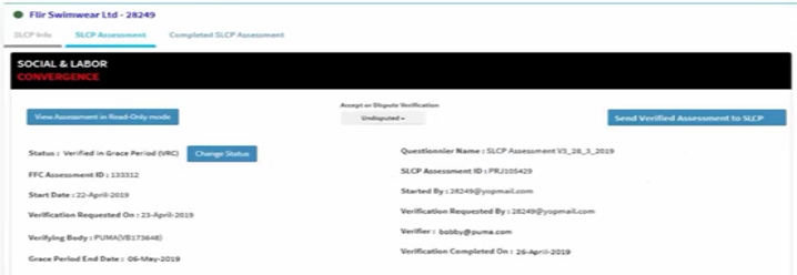 一旦验证者完成了验证,工厂将收到一封电子邮件通知,告知在宽限期内验证。宽限期为14天,在此期间,工厂可以在线查看验证报告或离线下载查看。如果工厂认为验证是真实的和可接受的或者选择什么也不做,则该验证为无可争议的并将发送给SLCP。后续会自动更新为VRF(验证已终结)。