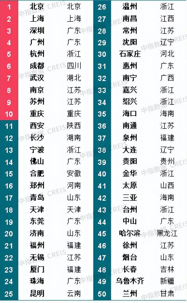 成都、武汉、南京、苏州、重庆位列6-10位,其中成都凭借成渝双城经济圈规划落地、人口持续大规模增加等有利因素,投资潜力仅次于杭州;武汉因疫情过后经济稳步复苏、人口持续回流,投资潜力有所提升;苏州装备制造、电子信息和生物医药产业发达,城市依托完备的产业结构和较强的人口吸引力,投资潜力保持不变。